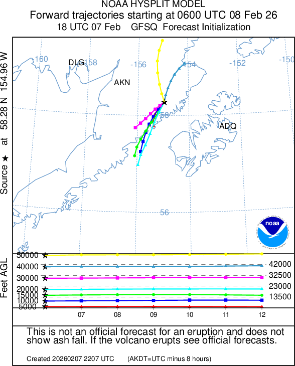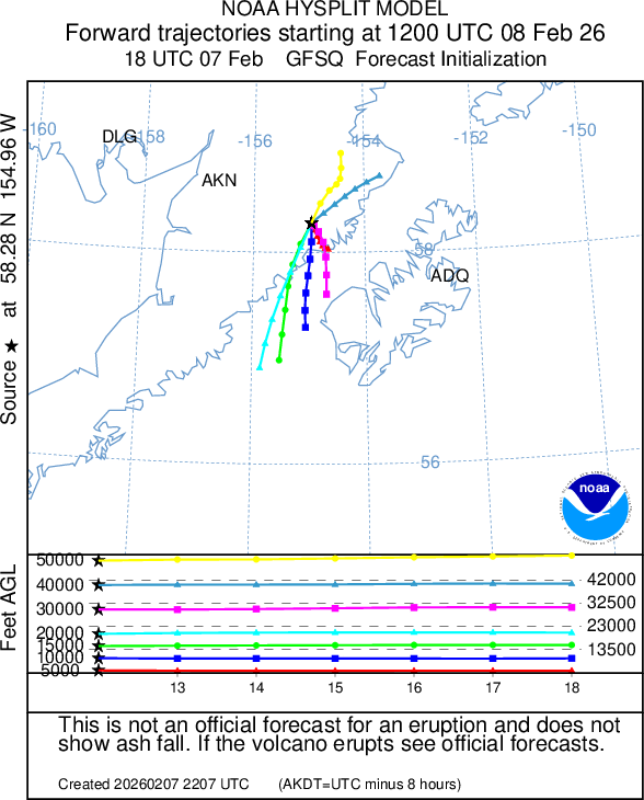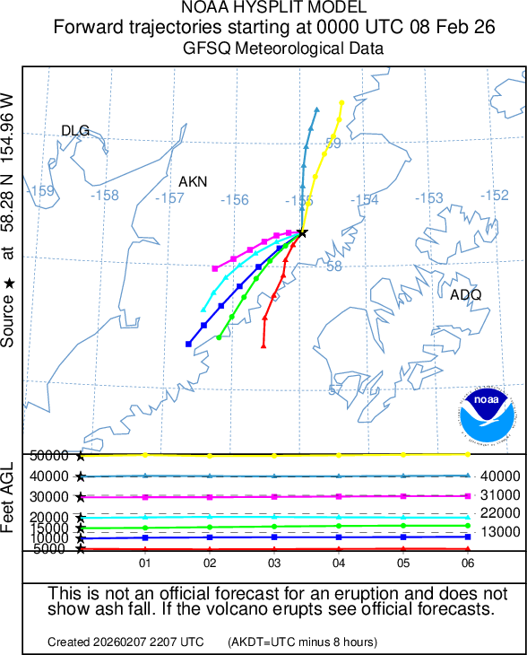 NOTE: these trajectories are from https://nomads.ncep.noaa.gov/pub/data/nccf/com/hysplit/prod/traj.YYYYMMDD Time help (UTC=GMT; local) ![]() Updated on Sat Feb 7 22:33:42 UTC 2026txt - Trajectory endpoints format help Forecast DetailsForecast trajectories summarized above come from https://nomads.ncep.noaa.gov/pub/data/nccf/com/hysplit/prod/traj.YYYYMMDD. The 6-h duration forward trajectories begin at the specified number of hours after the start of the meteorological model initialization. The trajectories are computed using meteorological fields output from the NOAA National Centers for Environmental Prediction (NCEP) Global Forecast System (GFS) forecast model. Details on the GFS gridded data used in these calculations are available on the meteorological forecast data web page. Trajectories starting at different heights are shown in different colors. The trajectory endpoints are plotted on maps (gif), displayed in text files (txt), and can be viewed in Google Earth. These are not official forecasts for an eruption and do not show ash fall. Related LinksAnchorage Volcanic Ash Advisory Center (VAAC)Washington Volcanic Ash Advisory Center (VAAC) Alaska Volcano Observatory (AVO) Hawaiian Volcano Observatory (HVO) HYSPLIT for current eruptions HYSPLIT for hypothetical eruptions Run HYSPLIT for any volcano