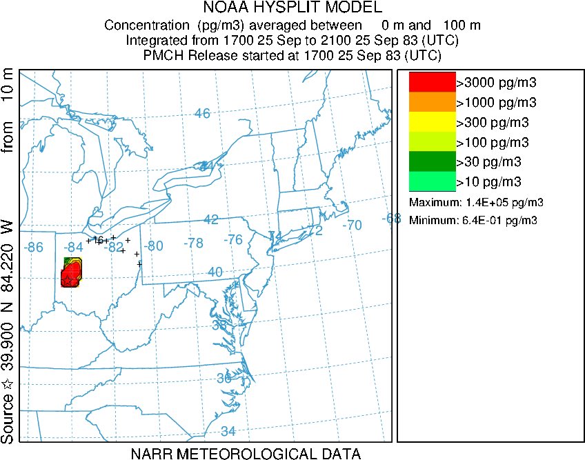 The original base case 68-h duration simulation was illustrated by an animation showing the sequence of model calculated three hour average concentration in comparison with the measurement data averaged over the duration of the sampling. Reproduce this graphic but use the measurement data corresponding with each sampling period.
