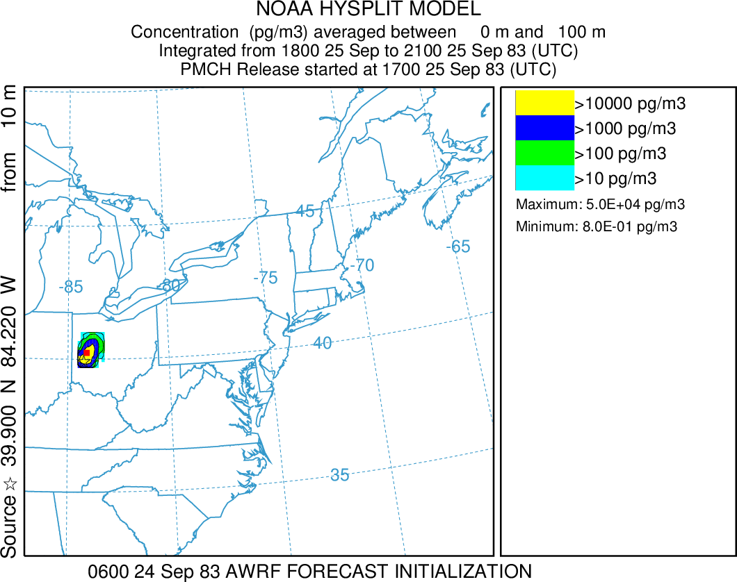 Do not proceed with this section unless the previous section has been completed and you have created two different output files in the working directory for CAPTEX release #2: hysplit2.bin with 3-hour average air concentrations and PARDUMP with all the particle positions every 3 hours.