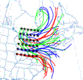 The trajectory ensemble option will start multiple trajectories from the first selected starting location. Each member of the trajectory ensemble is calculated by offsetting the meteorological data by a fixed grid factor (one grid meteorological grid point in the horizontal and 0.01 sigma units in the vertical). This results in 27 members for all-possible offsets in X,Y, and Z. Note: the starting height should be greater than 250 m for optimal configuration of the ensemble.